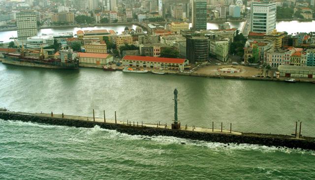 Oceano Atlântico. O ambiente é composto pelo Porto do Recife, pelo
